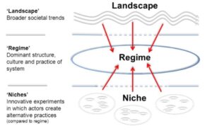 Das Transition Management geht davon aus, dass Regime mit einer evolutionären Logik funktionieren, erfolglose Experimente herausfiltern und nach und nach nützliche Innovationen auswählen und in ihre bestehenden Praktiken integrieren. Nischen sind sichere Umgebungen, in denen solche Innovationen wachsen können, geschützt vor dem Selektionsprozess. Der Druck aus der Landschaft ist der Schlüsselfaktor dafür, wie empfänglich (oder anfällig) das Regime für Nischeninnovationen ist (wird die Innovation das Regime ergänzen, reparieren, kitzeln oder stören?). Momente hoher Aufnahmefähigkeit sind Opportunitäts-Fenster, in denen radikale Innovationen zu Treibern des Wandels werden können. Wenn sie zu einer kritischen Masse akkumuliert und über verschiedene Subsysteme hinweg ausgerichtet werden, können sie das Regime transformieren oder sogar ersetzen (F. W. Geels, J. Schot / Research Policy 36 (2007) 399–417).