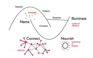 Ein System am Anfang seines Lebenszyklus wird von „Stewards“ gepflegt. Unter der Decke seiner Hoch-Zeit (in Transition Management Sprache: in den „Nischen“) treten Pioniere auf den Plan, die Innovationen voranbringen. Werden diese Inseln verbunden und gestärkt, bilden sie den Nährboden eines neuen Systems. Dessen Aufstieg kann mit dem Niedergang des alten Systems zusammenfallen (wie in der Nachspielzeit des Römischen Kaiserreiches zu sehen: nicht immer ein schöner Anblick). Um zu vermeiden, dass das alte System einfach in sich zusammenbricht und verschwindet, ist Hospiz- und Kompostierungsarbeit erforderlich. Für den geordneten Übergang vom alten zum neuen Regime müssen die Landeplätze des neuen Systems beleuchtet und der geordnete Umzug gesteuert werden.
