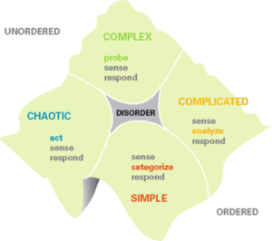 Zunächst lohnt sich hier der Blick auf den Kontext. Kontexte weisen mehr oder weniger wahrnehmbare Ordnungen auf, die jeweils unterschiedliche Navigationsformen erfordern. Eine hilfreiche Landkarte bietet dazu das Cynefin Framework, das vier Ordnungen beschreibt:
