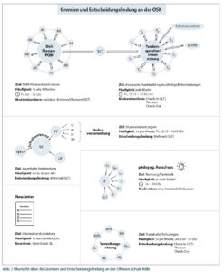- Klarheit: Klar festlegen, welche Treffen verpflichtend für wen sind und welche Treffen freiwillig. Z. B. unterscheiden zwischen selbst-organisiertem Arbeitskreis (gibt sich eigene Regeln der Verbindlichkeit) und Leitungskreis (an dem Personen mit Leitungsaufgaben verpflichtend teilnehmen). Eine gute Visualisierungen der Entscheidungsstrukturen sind sehr hilfreich, wie z. B. die folgende Übersicht Offenen Schule Köln:
