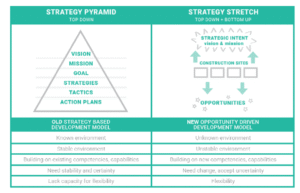 Die strategische Absicht ist bewusst so ambitioniert formuliert, dass sie die aktuellen Fähigkeiten der Organisation leicht überfordert (ein geplanter Strategic Stretch, im Gegensatz zum klassischen Strategic Fit, der auf das optimale Zusammenspiel vorhandener Kompetenzen mit bestehenden Marktchancen schaut). Aus dieser bewusst erzeugten Lücke zwischen Anspruch und Realität leiten sich Entwicklungsziele ab: sie beziehen sich auf die internen Kompetenzen, Strukturen und Prozesse, die aufgebaut oder transformiert werden müssen, um Chancen gezielter nutzen zu können – etwa schnelle Entscheidungsroutinen und fluide Ressourcenmodelle oder der Aufbau neuer Kompetenzfelder und Beziehungen. Die Entwicklungsziele bilden einen strukturierten Backlog für die Organisationsentwicklung über die gesamte Strategieperiode. In jedem Strategiezyklus werden dabei (+/-) 3 Entwicklungsziele bearbeitet.