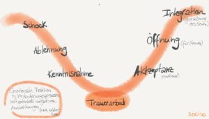 Gleichzeitig beziehen wir uns in unserer Arbeit als Veränderungsbegleitung oft auf Trauerprozesse, wie sie Elisabeth Kübeler-Ross in Ihrer Trauerkurve beschrieben hat. Denn die Phasen der emotionalen Verarbeitung können hier und da ähnlich sein.